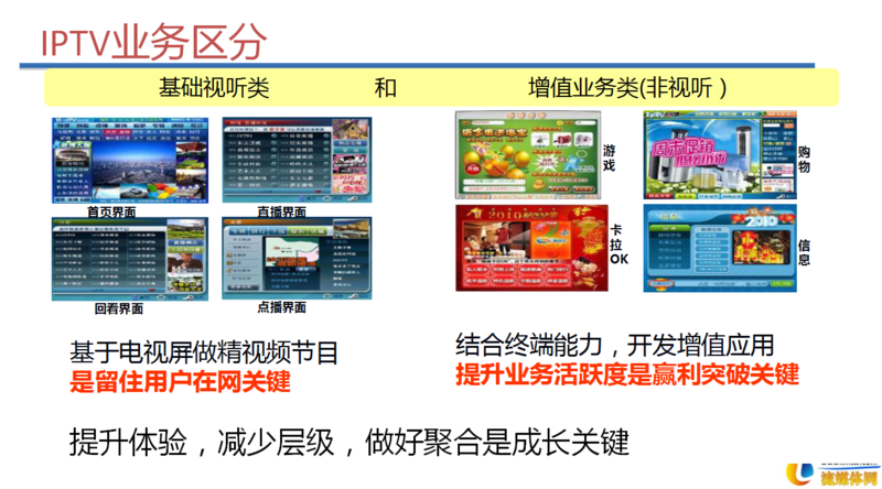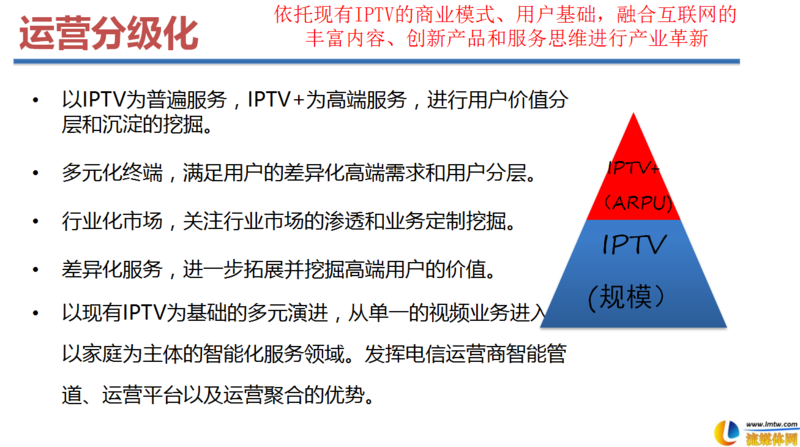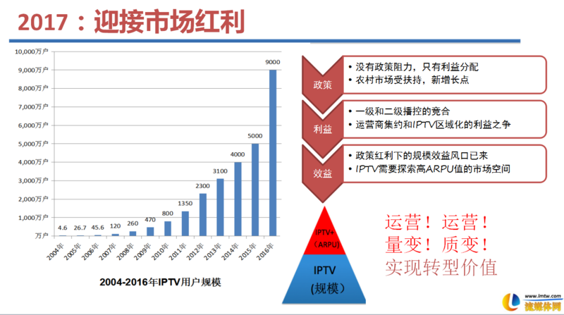 市场总体收入方面,2015年,中国电信IPTV业务总收入59.4亿,净收入约32亿;其中增值业务总收入14.9亿,净收入8亿;截至2016年6月底,中国电信IPTV业务总收入达37.3亿,净收入24.5亿。IPTV市场总体收入稳定增长。而随着规模的增加,2017年,运营将成为提升IPTV产业价值的最为关键因素。2017,赢在运营!