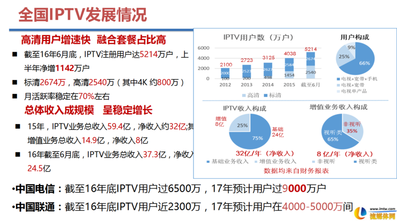 根据流媒体网统计,截至2016年底,中国IPTV用户总数已经接近9000万户。此外,2017年,流媒体网预测,中国电信IPTV用户将超过9000万户,中国联通IPTV用户则预计在4000-5000万之间。联通用户数的差异取决于于联通集团对于IPTV的战略决性。