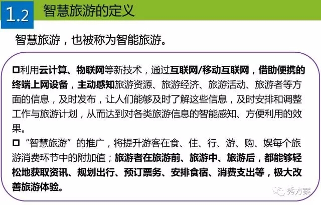 “智慧旅游”的推广,将提升游客在食、住、行、游、购、娱每个旅游消费环节中的附加值;旅游者在旅游前、旅游中、旅游后,都能够轻松地获取资讯、规划出行、预订票务、安排食宿、消费支出等,极大改善旅游体验。