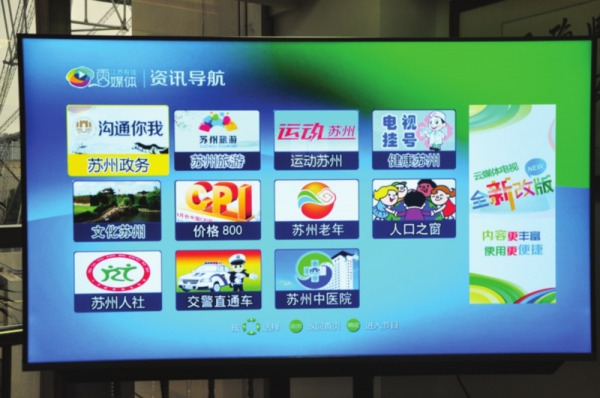 同时,江苏有线苏州分公司一直重视公共文化服务的供给工作。经过数年积累,苏州云媒体电视上线了《文化苏州》《苏州老年》《运动苏州》等14个电视文化信息服务栏目,推动公共信息与文化服务惠及全民,真正实现从“看电视”到“用电视”的转变。特别是与市文广新局合作建设了以“公共文化有线数字互动平台”为依托的《文化苏州》栏目,集中展示了富有吴文化特色的音、视频节目和大量的文字图片,视频节目达上千小时,真正实现了公共文化服务到客厅。为积极响应“数字图书馆推广工程”,江苏有线与吴江图书馆合作,打造了苏州首家电视图书馆——吴江电视图书馆,使读者足不出户就能享受到查询借阅信息、书目检索和图书续借等图书馆服务。在线下打造了100多个有线电视社区服务站。今年,江苏有线苏州分公司与市物价局、卫生局、文广新局、东吴人寿等部委办局、企事业单位合作开办了《价格800》《苏州老年》《健康苏州》《文化苏州》等14个电视信息服务栏目。