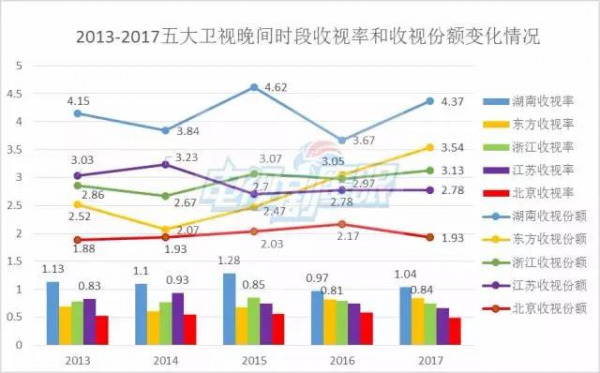通过2013-2017年五大卫视收视变化之下内容布局的调整和对比,以及2018资源储备,不难发现,五大卫视在“拥抱互联网、新生代观众”上殊途同归,在契合平台特色的风格下求变求新,目前来看,卫视格局瞬息万变,要想稳占铁桶江山,还有得一拼。