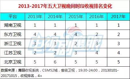 纵观2013-2017五大省级卫视晚间剧场收视排名变化,湖南卫视一直独占鳌头,浙江和北京卫视也相对稳定,东方和江苏卫视有一定波动,东方卫视进步明显。