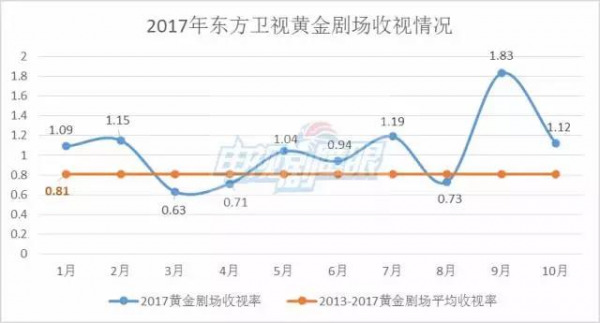 2013-2017年,东方卫视黄金档平均收视为0.81%,2017黄金剧场大放异彩,过去的十个月中有七个月保持在均值水平以上,2月的《三生三世十里桃花》,5月的《欢乐颂2》,7月的《我的前半生》,9月的《那年花开月正圆》多部全民共赏的电视剧引领话题收视,有望拉升全年黄金档收视,创下2013年以来历史新高。