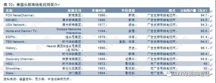 2.新渠道兴起对内容端都是一次重构,新的巨头出现,压缩老巨头空间,但并不代表完全替代。有线电视行业的兴起,对传统电视内容端重构是显而易见。一方面,一批有特色的有线电视网兴起如CNN,HBO(最后合并成为时代华纳)等,且凭借付费频道商业模式进一打开了行业成长空间;另一方面,三大传统电视网ABC,CBS,NBC的生存空间虽然有所压缩,但因为其在内容制作和整合方面强劲的实力,仍然占有一席之地,而且以内容整合商的角色在数千亿美元的美国有线电视占据重要的角色,NBC,CBS,ABC,FOX年收入都在100-200亿美金之间。而且,传统四大后来在有线电视网运营方面可圈可点,例如FoxNews就成为规模最大有线电视网,拥有9500万订户。