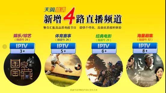为了不同人群提供个性化、优质的娱乐、体育、观影体验,福建IPTV-天翼高清又新增4路直播频道。分别对央视3套、5套、6套、8套的节目重新编排,直播频道IPTV3+(频道号24)、IPTV5+(频道号26)、IPTV6+(频道号29)、IPTV8+(频道号32)。