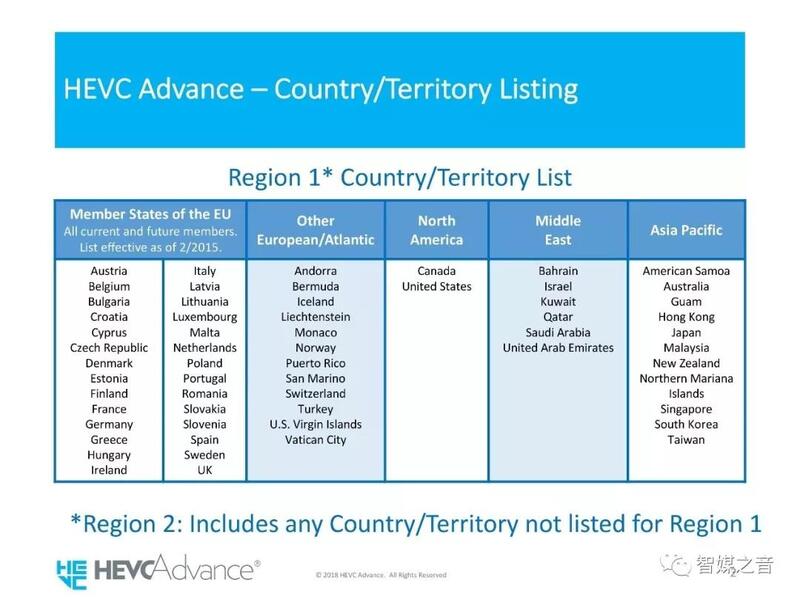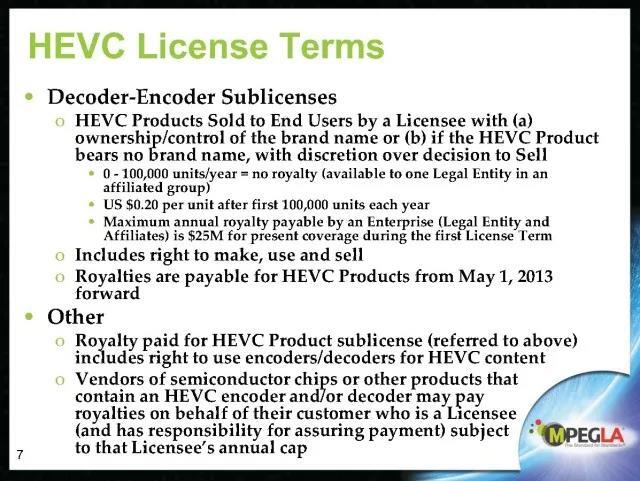MPEG LA公司是全球领先的各种标准和其他技术平台的一站式许可证提供商,从20世纪90年代开始就开创了现代专利池,上一代应用最广泛的标准H.264也是由该公司来提供许可授权的。具体的许可政策如下: