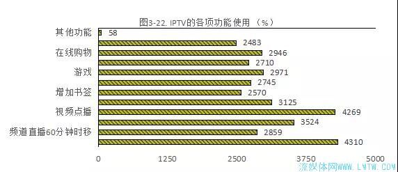 频道直播功能,视频点播功能,频道48小时回看功能。最受欢迎的IPTV免费点播内容:电影,电视剧,娱乐节目。一半以上用户观看过IPTV收费节目,观看最多的三项付费节目分别是看大片,首映,热剧。