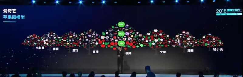 他表示,几年前爱奇艺的生态模型叫大苹果树模型,树干就是爱奇艺的技术平台,在它的支撑下苹果树长了很多苹果,每一个苹果代表一种业务类型,譬如综艺、小说、漫画等等。但是发展到现在,业务规模太大了,已经不能用一棵苹果树来形容爱奇艺的商业模式,已经长成了一片苹果园。