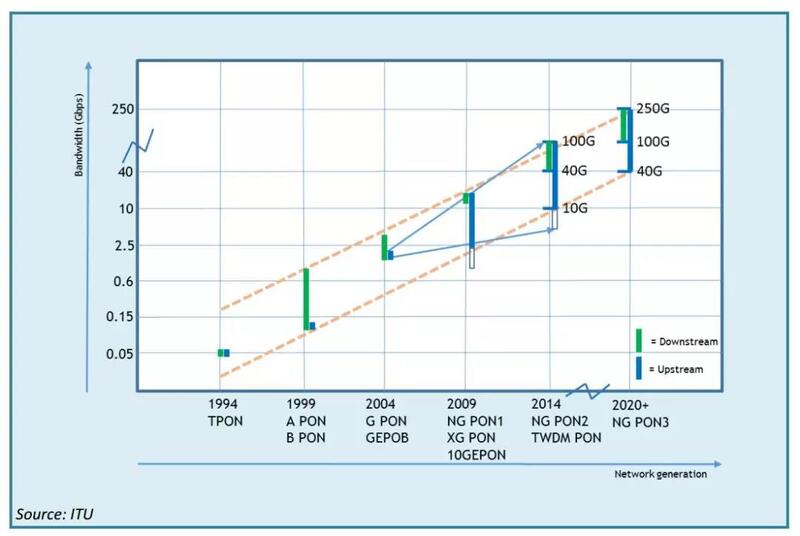 如今,光纤基础设施的部署都基于GPON,NGPON2以及XGPON,他们有可能在同一个物理线路的不同频谱上共存。GPON(ITU-T G.984.x series)以及1G-EPON(b-IEEE 802.3)目前标准化,也正在全球积极部署,相关性能可以参看下表。