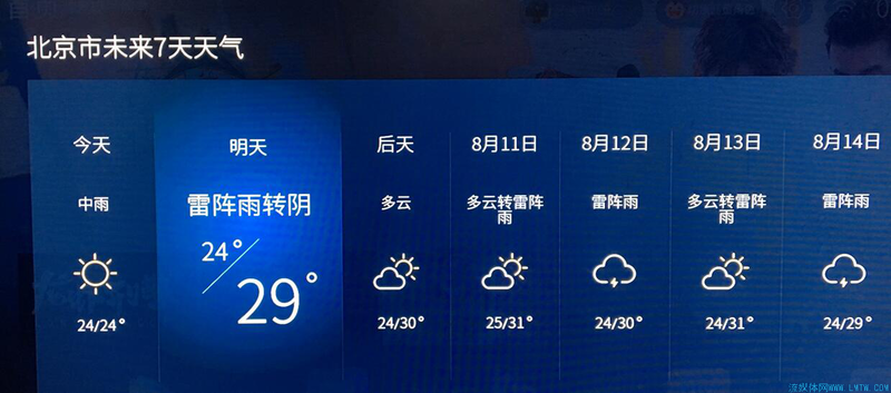 3)查天气:“明天的天气怎样”,会跳出北京7天天气预报,并且“明天”着重突出,识别很好。