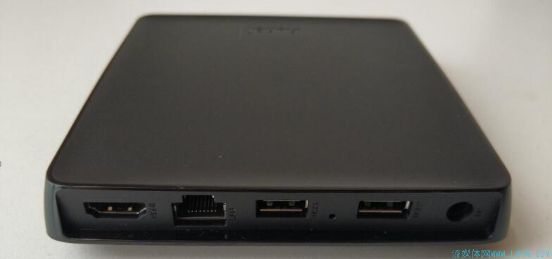 HDMI口、网口、USB口(2个)、电源口在盒子后面一字排开,盒子前面则有四个不易发现的小孔——孔小作用大,这是专为电视环境设计的四孔阵列收音MIC,支持远场语音操控。