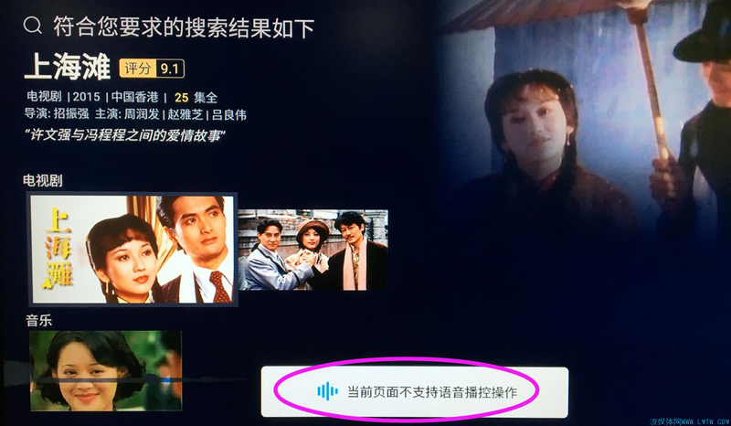 测试方向:1)搜片:进行了多次测试,如“我想看梁朝伟的电影”“我想看周星驰的电影”“林志玲”“我想看最新综艺”“播放《上海滩》”,可以感觉到盒子的学习过程,一开始搜片名比明星效果好,但用了一会之后,明星搜索也越来越好。经实测,说我想看XXX的电影比我想看XXX识别度好很多,推测也许与其关键词设定有关。但有个情况,即使你说的是“播放”某某影片,声音给你的提示也往往是“搜索”某某影片,搜到之后有的自动播放,有的则不,显示“当前页面不支持语音播控操作”,都是芒果TV的内容,我们未能摸索到规律,只能揣测也许是尚未适配完毕?