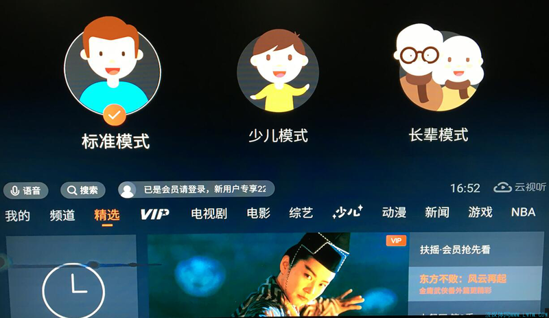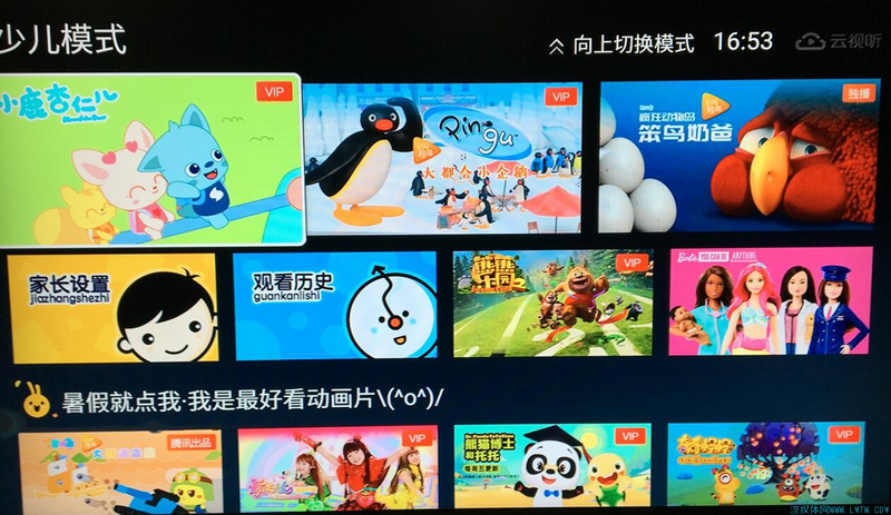 我们测评中发现,预置的云视听极光也有分角色,一共三种:标准、少儿、长辈。不过长辈模式虽然打开首界面长的不一样,点进去内容却跟标准模式没啥区别,相较之下还是少儿模式走心。虽然界面没有特别设计,但是可以设定少儿闹钟和黑名单十分贴心,而且视频播放过程中也会提示用菜单键可以设置观看时长,建议彼此取长补短。