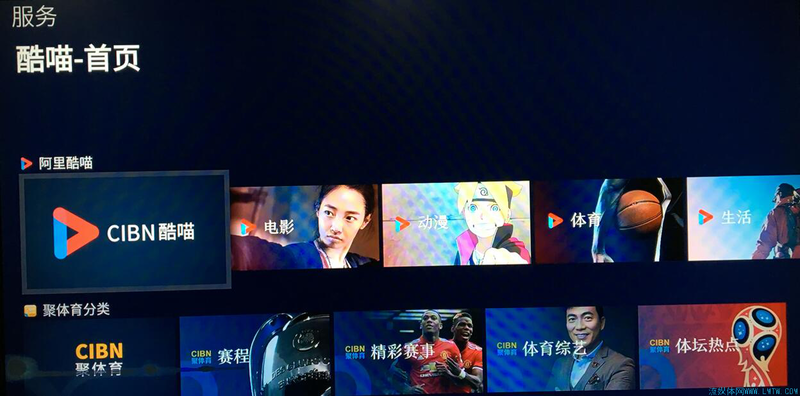 三、“服务”栏目:主要是各类应用和各平台的内容专题,包含一些常使用的应用和特色应用,其中一部分在首页首屏亦有推荐。这个栏目里有个令人惊艳的思路,把每家的内容像做栏目一样拆分成APP组,比如酷喵变成酷喵电影、酷喵动漫、酷喵体育、酷喵生活,芒果TV变成芒果TV电视剧、芒果TV综艺、芒果TV电影等等,这样你会更容易找到自己想看的内容,并且点播路径无意中被贴心的缩短了。