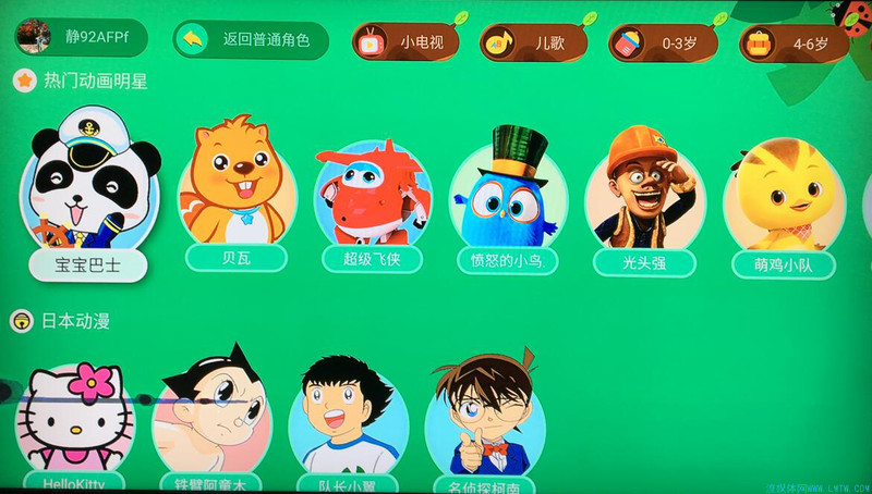 儿童版用的绿底色,有叶子、青蛙、瓢虫、蘑菇等孩子们喜欢的元素。简单按照年龄段、动画明星等做了栏目,“小电视”栏目是把一些热门内容归在一起,还蛮可爱的。
