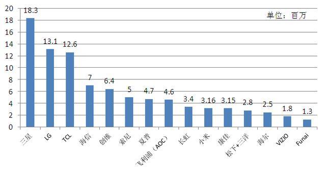 排名12位的是松下,销量280万台,这其中也包括三洋品牌的销量,因为松下收购了三洋的电视业务。海尔电视机以250万台的销量仅随松下之后,海尔借助在全球的白电产品品牌的知名度,也带动了海尔电视的海外扩张。