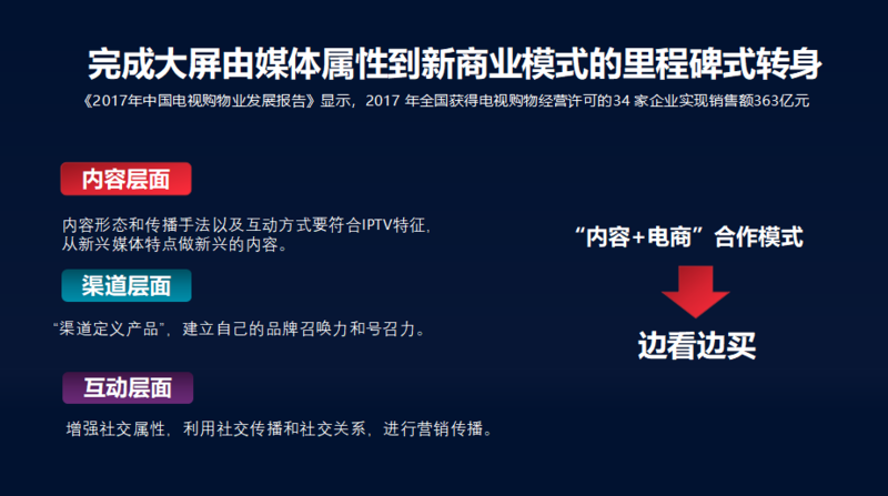 前面说到我们有本地化的服务、有垂直化用户的圈层,这些都为互动电商提供了一些从内容面、渠道面、互动面的辅助,这和传统的电商不一样,也和传统的电视购物直播频道不一样。因为IPTV平台具有独特的技术优势、技术能力,我们能够通过内容来区分用户,在内容的接收环节中,直接把用户的流量、用户的注意力变现。