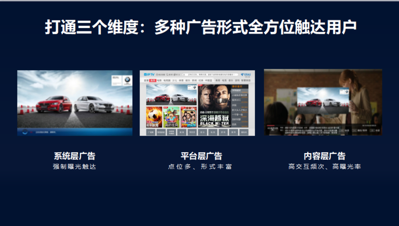 在我看来,我认为三种形式的广告值得深耕,一是开机系统层的广告、二是平台层广告、三是内容层广告。但是,在IPTV运营广告之前,我们还需要解决三个问题:第一是科学的监测评估标准,第二是互助的数据分享体制,第三是统一的广告运营。