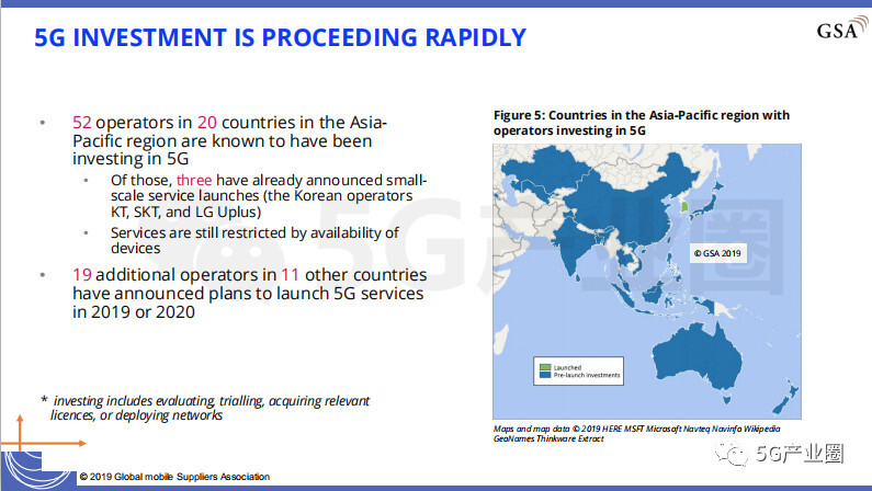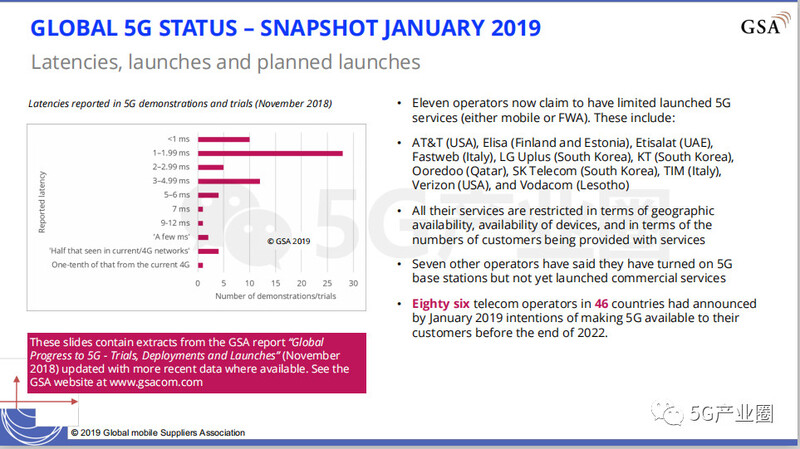 全球移动设备供应商协会GSA的最新报告显示,截至2019年1月中旬,全球已有11家运营商共8个国家推出了5G服务,分别为: