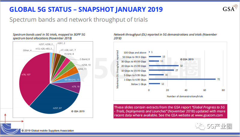 在GSA的统计中,目前在全球运营商的5G试验中,使用最多的频段是n78频段(3.3GHz-3.8GHz),共有107个试验采用了这一频段;其次为n257频段(26.5GHz-29.5GHz),有87个试验使用了这一频段。