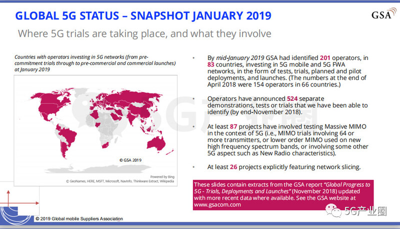 此外,GSA报告还显示,目前全球已有83个国家的201家运营商对5G移动网络和5G固定无线接入(FWA)网络进行了投资,运营商们已经宣布了524个独立的演示、测试或试验。