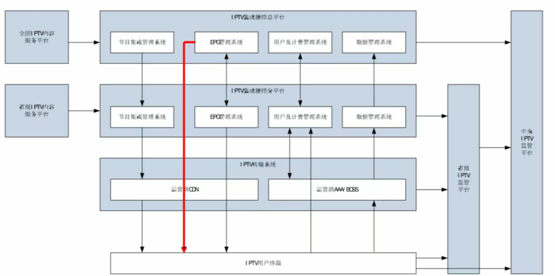 在“4.5 体系架构”最让人感到意外的系统接口是IPTV集成播控总平台的EPG管理系统与用户终端间的连接线(下图红线部分),即集成播控总平台能够直接为机顶盒提供EPG服务。