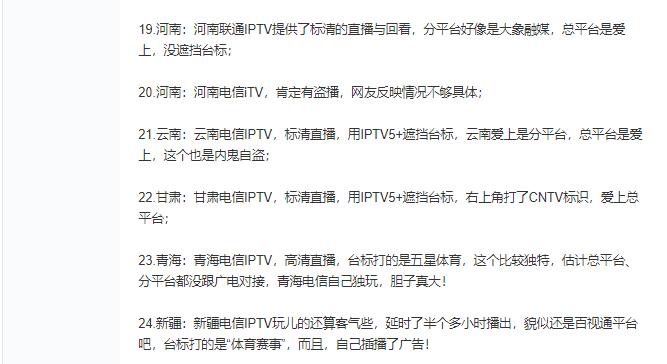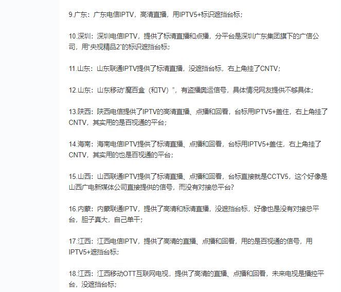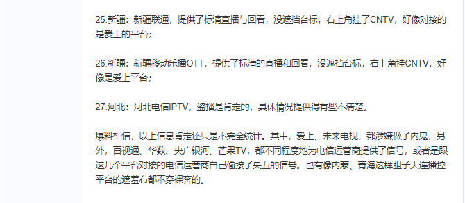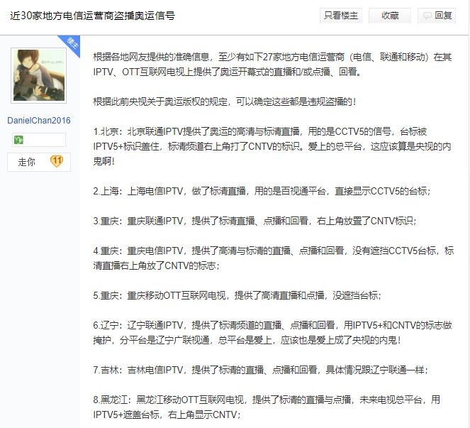 PS:除了上述地方广电网络公司举起了维权的“大旗”,当年各地好心的网友更是提供爆料,提出全国至少有27家地方电信运营商(联通、移动、电信)在其IPTV、OTT互联网电视上提供了奥运开幕式的直播和/或点播、回看。