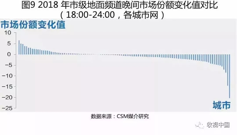 相比省级地面频道,城市台面临的压力更大,在112个城市调查网中,市级频道整体平均份额从7.4%下滑到6.7%,仅41家城市台上涨,有2个地区的城市台晚间份额下降超过了10个百分点(图9)。城市台之间的竞争力也存在很大的差距,2018年城市台份额最高的20个城市,城市台平均份额达到30%,而份额最低的20个城市,平均份额只有1.2%。