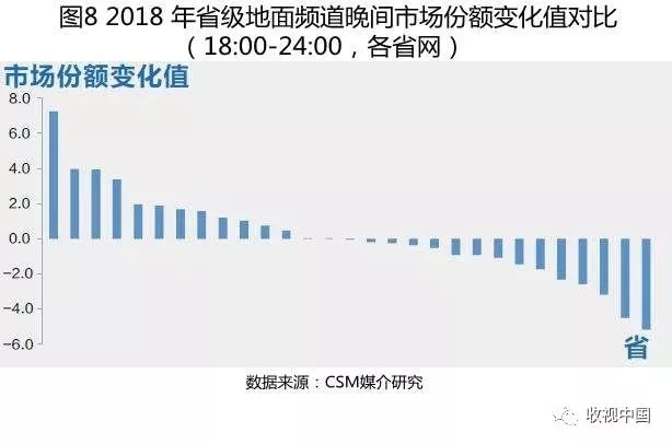 2018年,地面频道整体依然处于下滑趋势中,省级地面频道皆呈现竞争动力不足的迹象,整体份额有所下降,比2017年同期减少了0.7个百分点。在25个省网及4个直辖市的省级地面频道中,有14个地区份额上升,其中辽宁省的省级地面频道份额提升7.3个百分点,提高幅度达到29%,其次是天津和湖南,提升幅度分别为14%和8%(图8)。就绝对值来讲,各省的地面频道竞争力有着显著的差距,竞争力最强的湖南省级地面频道,市场份额高达50.72%,其次是上海、山东和广东,份额也都超过了40%;在一些经济发展相对落后的西部省份,省级地面频道的市场占有率只有5%左右。