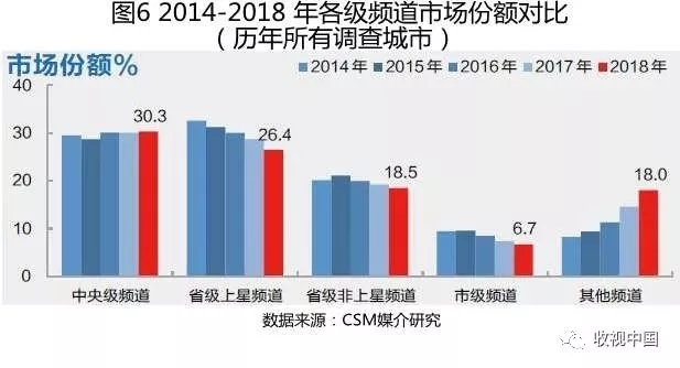2017年之前,中央级频道、省级上星频道和地面频道基本维持着“三足鼎立”的局面;2017年这种均衡被打破,省级卫视市场份额跌破30%;进入2018年,均衡的状态则进一步被撼动,中央级频道份额稳中略上扬,达到30.3%;而省级上星频道份额出现明显的下滑,市场份额进一步降至26.4%,比2017年同期减少了2.3个百分点;地面频道组竞争力进一步减弱。