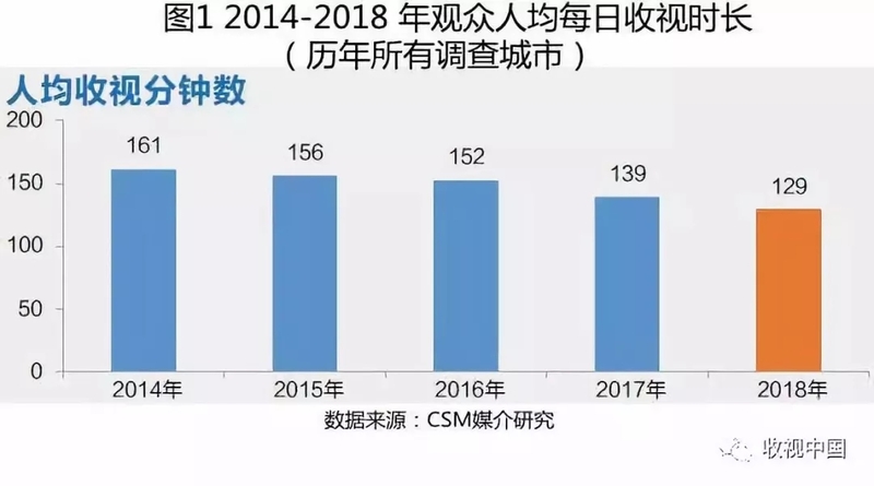 2018年,全国观众平均每人每天收看电视129分钟,比2017年同期少了10分钟,下降幅度为7.2%,与上一年的8.6%相比,下降幅度略有缓和。但也不能否认,人均收视时间与2014年相比减少了32分钟,在短短的5年间缩短了半个小时之久,随着媒体融合步伐的深入,受众获得信息的途径更加多元,便捷的移动互联加速了受众分流,收视竞争进一步加剧(图1)。