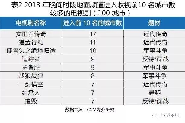 地面频道电视剧热播类型依旧集中在近代传奇、反特/谍战和军事斗争,但2018年还有部分悬疑等小类题材收视表现较好,近代传奇《女匪首传奇》在17个城市收视进入前10名,其次是《猎金行动》。军事斗争剧《硬骨头之绝地归途》也普遍受到欢迎,在10个城市进入收视前10的阵营(表2)。