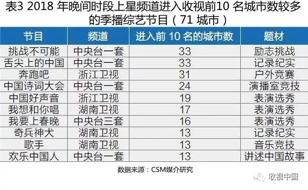 CSM媒介研究季播真人秀统计数据显示,2018年季播真人秀共播出203档,首播收视率超过1%的季播节目共计16档,收视率超过2%的节目仅有一档浙江卫视的《奔跑吧》,综N代节目勉强支撑收视,高收视季播综艺的难觅,凸显了综艺节目创新的尴尬。收视表现比较好的季播栏目中,中央电视台综合频道有4档上榜,分别是励志挑战类节目《挑战不可能》、介绍各地美食的纪录片《舌尖上的中国》、2017年即大放异彩的文化类节目《中国诗词大会》以及讲述新时代中国故事的《欢乐中国人》;湖南卫视歌唱类节目《我想和你唱》及《歌手》和警犬伙伴励志成长特别节目《奇兵神犬》受到观众的欢迎,此外,浙江卫视《中国好声音》在多个城市都获得不错的收视成绩(表3)。