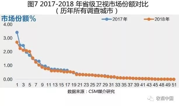 2018年,只有8个频道市场份额高于1%,与2017年同期持平,排名首位的卫视频道份额为2.7%,比2017年同期减少了0.72个百分点,下降幅度达到21%。在全部卫视频道中,只有14家份额提升,其中排名第5位的频道份额提升了0.27个百分点,是提升最多的一个频道(图7)。