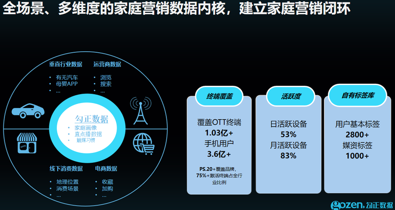 总的来看,目前勾正数据日活设备为53%,月活为83%,用户基本标签是2800+,所以具有很强的赋能和运营价值,这也是整个服务的模型,我们希望通过数据帮助行业实现更多的广告价值。