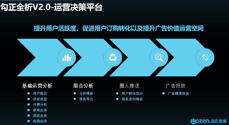 第一是赋能专网用户提升活跃度。无论是IPTV还是移动最重要的就是圈用户,移动和联通依然处在这个过程。专网用户和OTT用户的差别是在哪里?一个是日活,一个是收视时长,都有很大的提升空间。怎样帮助IPTV提高用户激活和活跃度?是急需去做的事,这个事情解决才会有更大的运营空间和价值。怎么去做这件事情?勾正通过数据运营、数据产品、数据开发帮助IPTV运营商,也会有些数据产品,到时候会和大家详细去讲。