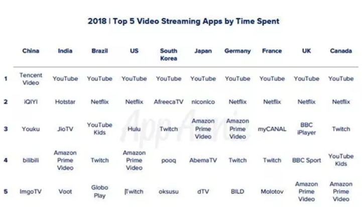 (2018年各国观看时间最长的流媒体APP前五名 图源:App Annie)