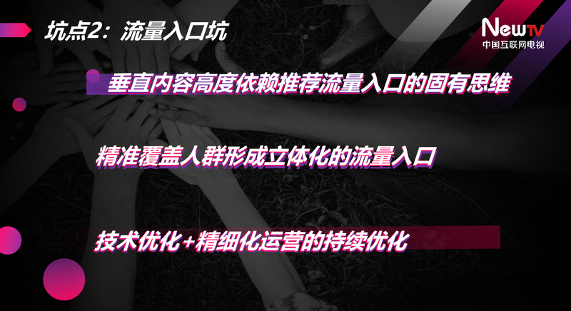 第三个坑,变现模式坑。这个是什么意思呢?从海量的电视大屏用户里捞出来忠诚用户不容易,从忠诚用户转化为商业收入的转化率也不容易。我是做传统媒体出身的,跟大家讲一个亲身经历的案例,我们参与过一档美食探店节目的自媒体运营,获得用户的过程简单粗暴但有效,就是在节目播放过程中加二维码,观众变用户的转化率能达到30%,公众号短时间迅速积累起50万的粉丝,都觉得不可思议。而我们的垂直内容在新媒体平台,反倒没有这些条件可以利用,观众转化为忠诚用户的转化率能有多少?3%?0.3%?真的很低。不能有效获取忠诚用户,就不能丰富我们的商业打法,只能走简单的付费增值转化。