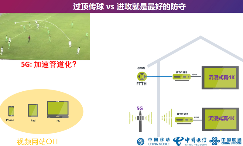 我们这个论坛,是以IPTV\OTT为主题,我实际上更关注的是运营商IPTV/OTT这个具体市场,因为本人二十多年一直在运营商的市场耕耘。我之前经常会跟行业人士在聊目前纯互联网OTT视频业务出来之后,对原有的有线电视行业,包括对现在正热的IPTV业务会有比较大的冲击。其实OTT这个词是从国外过来的,它就是过顶传球的意思。对于运营商来说,你怎么能够跟现在纯互联网的OTT视频业务竞争呢?我个人认为,就像足球比赛一样,对手可以有过顶传球,然后我们的策略是主动出击做最好的防守,所以我们要找出我们的网络优势,在高带宽、4K、8K上面推高价值的内容,比如好莱坞真4K内容、国际大IP云游戏。