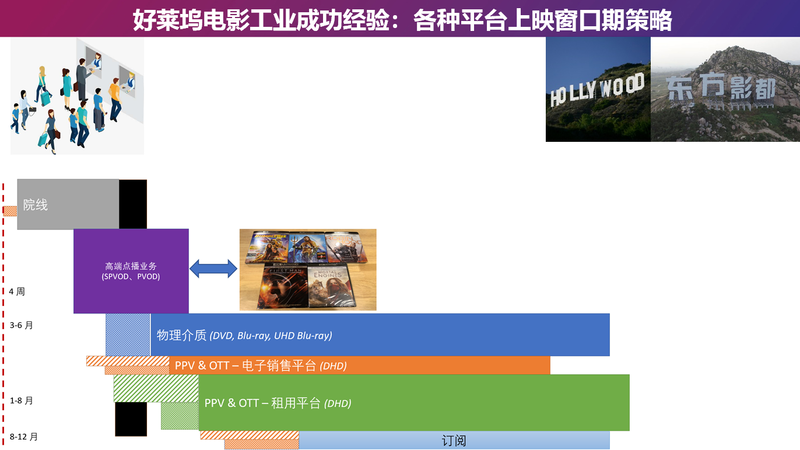 时间关系,我切入我的主题。这里面我强调一点,在每次的流媒体论道,我都会提到这张图,但是每次都会有些新的解读,即好莱坞电影窗口期。