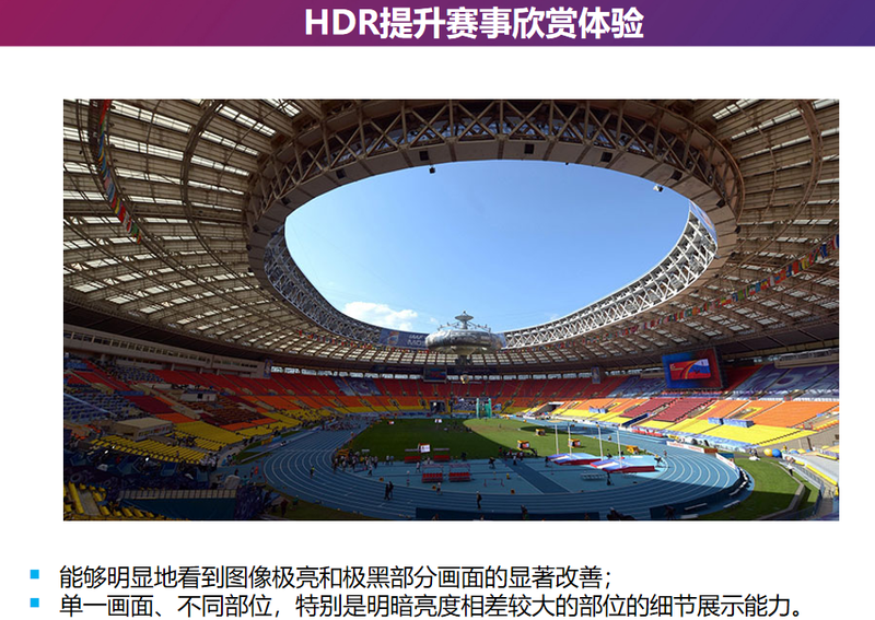 这里面有一个非常典型的HDR应用场景,在看体育直播赛事的时候,在太阳照射与阴影分界线的地方,如果没有HDR技术,基本上你看到的足球都是虚的。即有了HDR技术,可以大大增强这种临场体验。
