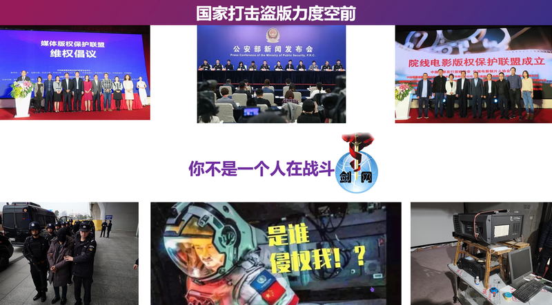这里面我提一下,在今年春节,出现了一个院线春节档盗版的大事件,我估计在座人都知道,包括《流浪地球》等这几个大片,在互联网的微信群里面盗版链接非常多,这件事从国家层面特别重视。经过几个月的时间,已经把盗版源头查出来了,上个月月底的时候,国家相关部门已经公布了这次春节档的盗版事件,原理就是利用了原来一些电影院的播出设备,把电影翻录下来,发布到互联网上面。庆幸的一点是什么?现在的院线里面,都采取了DRM和水印的保护措施,这也就是好莱坞这些片商一直严格要求的版权保护措施,只有有了这些版权保护技术手段,才让政府相关部门来查到春节档这个大的盗版集团的行为。这在我们行业里是一个非常的好事情,就是可以通过技术手段、行政手段、国家的政策来把整个中国的版权环境做得更好。