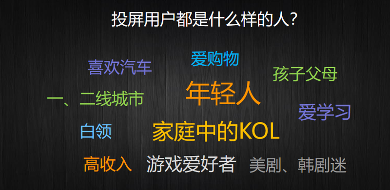 是什么样的一群人在每天使用着这个投屏?几个标签:有喜欢购物的,喜欢汽车的,有爱学习的,有游戏爱好者,韩剧迷,美剧迷,包括他们都集中居住在一二线城市的白领,收入是比较偏中上的。这一群人他们统一的特征是,他们是家庭当中的KOL。KOL是什么?就是意见领袖,他在这个家庭里面对很多新鲜的事物是第一个会尝试去用的,从而传达给家庭的其他人。所以说我们的用户是这样的一群人,每天在使用着手机跟电视大屏的交互,这将给电视这整个行业带来什么样的价值?