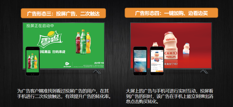 除了刚刚讲的,我在投屏前面加的前贴广告之外,我们同时还开创了更多的手机跟电视大屏互动的广告。比如说我们在投屏之后,看广告的时候手机会收到一个消息,就是这个广告的购买详情和落地页,用户如果感兴趣,可以在手机上去点,这真正的把大屏广告做到可看、可点、可购买、可转化。