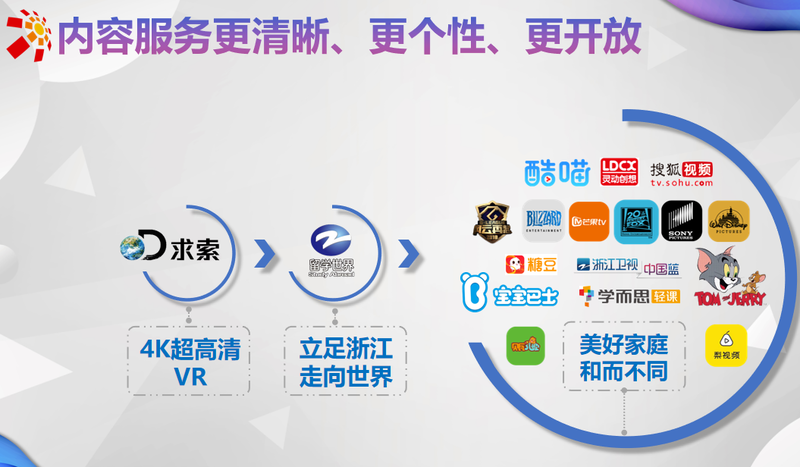 除了这个问题,如果只是我能够提供支撑能力的话,可能永远是不够的,在内容部分还需要更多的布局和探索,我认为,内容反而会很重要,提供再多的服务都是底层的,再多的数据都是支撑性的,对于真正应用的老百姓或者用户来讲,没有那么深刻的感触,我要用它,或者我喜闻乐见去使用它,内容就很重要,所以我们重点打造内容的板块,或者智慧家庭内容板块,就是现在我们重点布局的:一个是4K超高清或者VR,还有求索这个品牌。