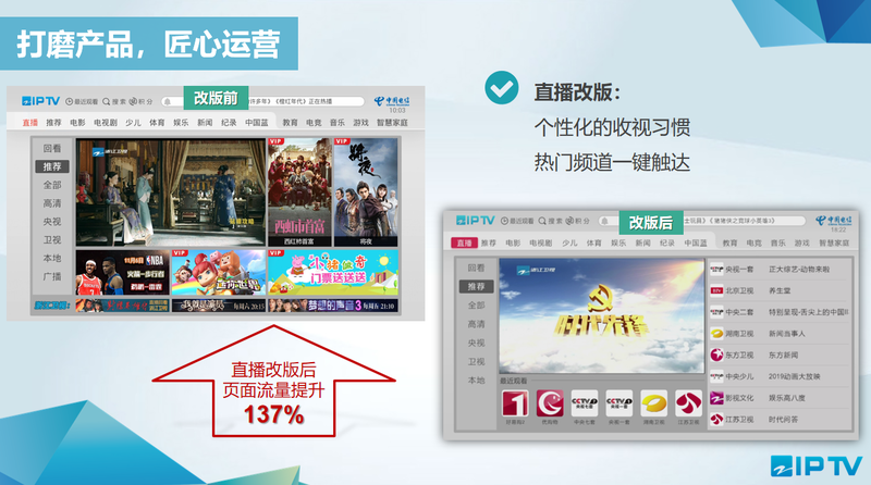 这是我们过去的直播页面,我们把每一个角落充分利用起来,因为我们认为IPTV直播的用户依然是主流,效果也不错。今年我们进行了改版,我们把所有的推荐位都拿掉了,根据每个频道的收视率,进行推荐,这个编排是每天不断变化的。同时底部是用户个性化的选择,你每天收看超过二十分钟的频道,会出现在这里。实现了直播频道的智能推荐和千人千面。