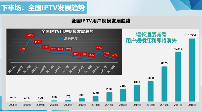 从2015年到2018年,尽管IPTV的用户量还在不断增加,但是用户增长的幅度已经非常明显的放缓。从2016年的73%,到2017年的41%,再到2018年的27%,2019年可能会更小。整个增长的绝对值,在明显下滑。