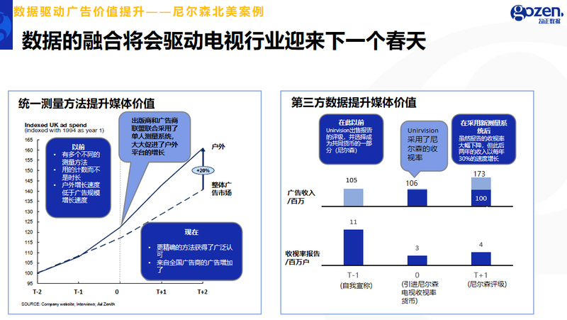 这边列举一个尼尔森在北美的案例,真正的数据货币体系的建立是完全能够驱动整个行业的广告价值发展,左边的图是一个户外广告的例子,统一的测量方法提升媒体价值,以前有多个不同的测量方法用的计数而不是时长户外增长速度低于广告规模增长速度,现在更精确的方法获得了广泛认可来自全国广告商的广告增加了。尼尔森在北美采用了统一的方法测量以后,大大提升了户外广告的媒体价值。右边这个是北美的OTT市场发展,在当时媒体宣称的量是11,是非常多的了。引进OTT以及尼尔森的电视收视率的货币之后,我们发现真实的媒体的量可能并没有媒体本身宣称的那么多,加起来仅有3。 我们的品牌主在看到原来的投放是105,可能在引进尼尔森的数据之后,投入变成106,可能不会有很大的增长,但过了两年之后,收入会被大幅地提升,从106涨到173,这就是尼尔森的三方数据,真正的去衡量各个媒体的价值,会极大地给广告主信心,会为他把大的金额,大的预算砸到这个媒体,提供了很好的测量,很好的帮助。