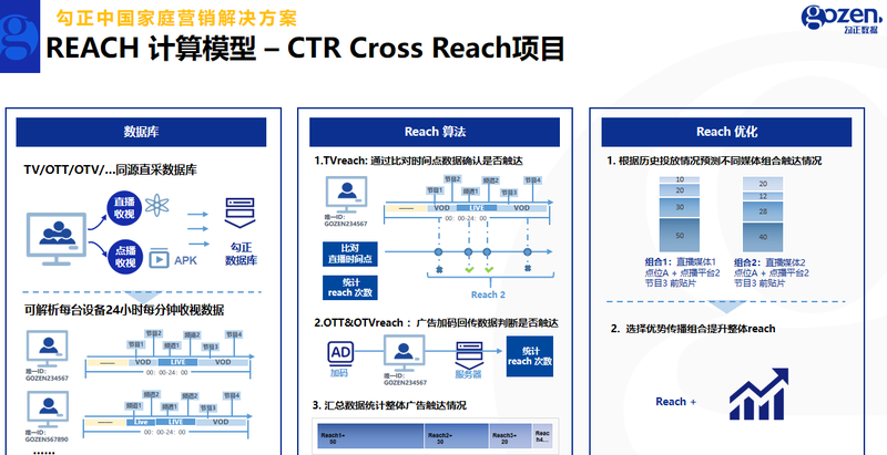 另外,还有Reach的计算,我们勾正通过大屏和小屏之间的关联,一起合作了Cross Reach项目,通过这个数据库,我们可以去算大屏、小屏加上手机以及像户外等等,去算一个综合的到达。