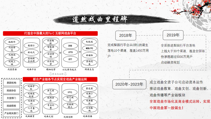 这是梨园行的发展规划,2018年我们实现了从0到1的诞生,也是我们的起点。接下来我们将实现平台的全方位拓展,之后对于整个产业链的连接是我们的一个挑战。2020年-2023年,我们还将成立全资子公司,推动戏曲教育、戏曲文创、戏曲创新、戏曲传播等产业链板块的发展。
